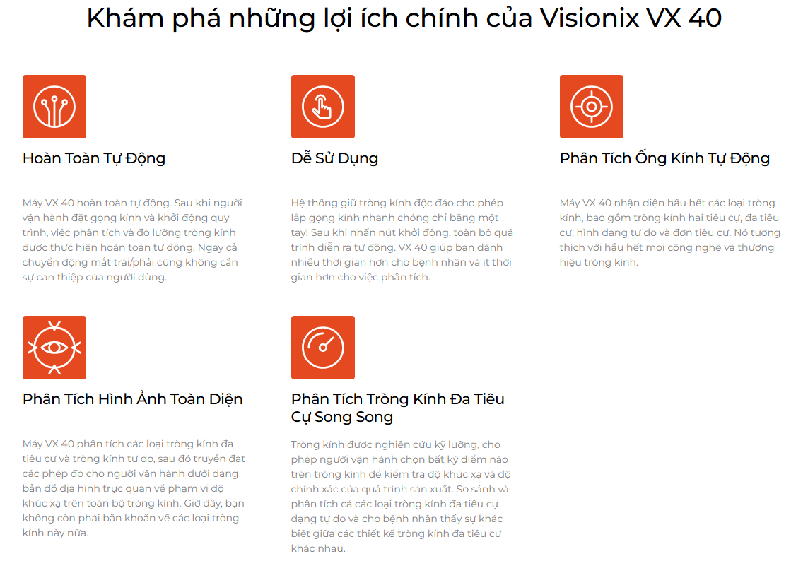 Công nghệ sóng ánh sáng Visionix cho phép bạn phân tích chi tiết đầy đủ một thấu kính chỉ bằng một nút bấm trong vòng 30 giây. Máy đo thấu kính tự động Visionix VX 40 có thể phát hiện và phân tích các loại thấu kính hai tiêu cự, đa tiêu cự và đơn tiêu cự, đồng thời tương thích với hầu hết các công nghệ và thương hiệu thấu kính. VX 40 được bao gồm trong bộ dụng cụ đo khúc xạ Eye Refract hoặc được bán riêng.