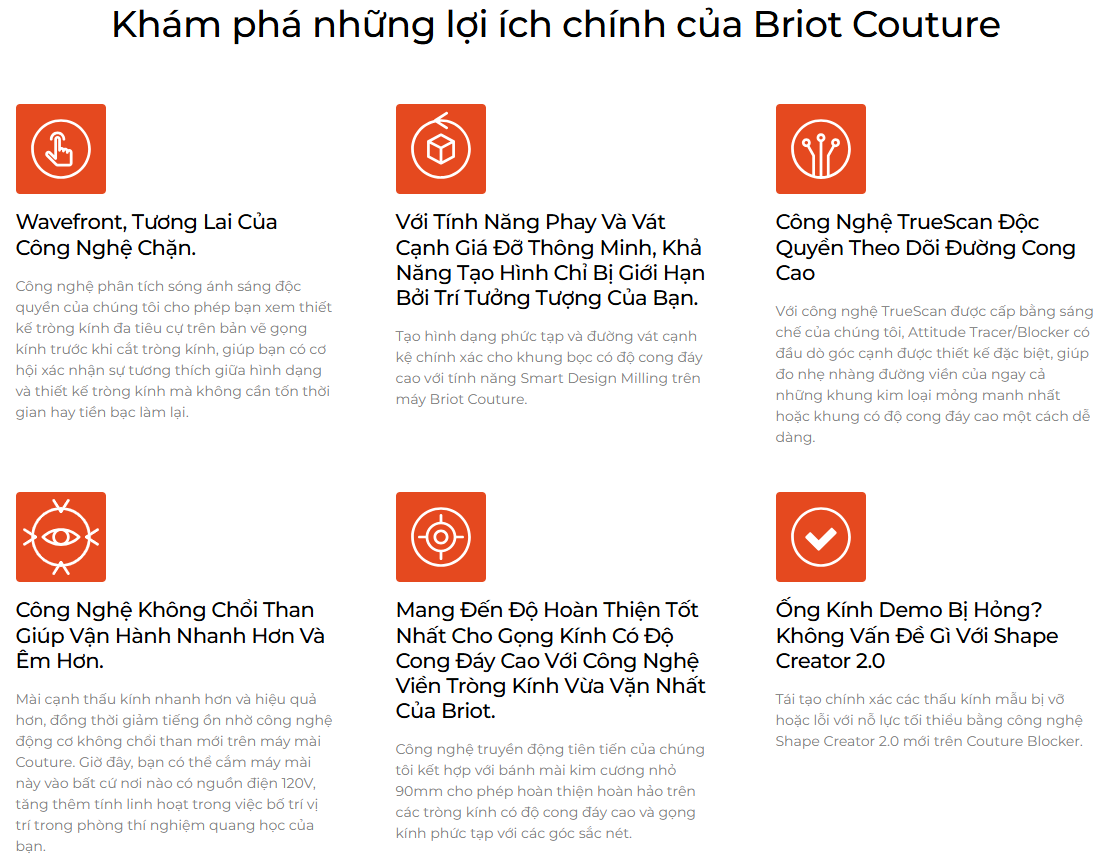Khi tiêu chuẩn của bạn cao, đây chính là đối tác bạn xứng đáng có được. Là một cuộc cách mạng trong công nghệ mài cạnh, Briot Couture mang đến cho bạn đường mài hoàn hảo cho mọi gọng kính – bất kể kiểu dáng, hình dạng hay độ cong nào. Công nghệ xem trước 3D cho phép bạn thấy kết quả trước khi bắt đầu công việc. Công nghệ TrueFit tính toán độ cong để đảm bảo sự kết hợp hoàn hảo giữa tròng kính và gọng kính. Thêm vào đó, các cảm biến mới kết hợp với phần mềm tiên tiến duy trì áp lực không đổi lên tròng kính, giảm thời gian chu kỳ mà không có nguy cơ lệch – đặc biệt là đối với tròng kính chống nước.