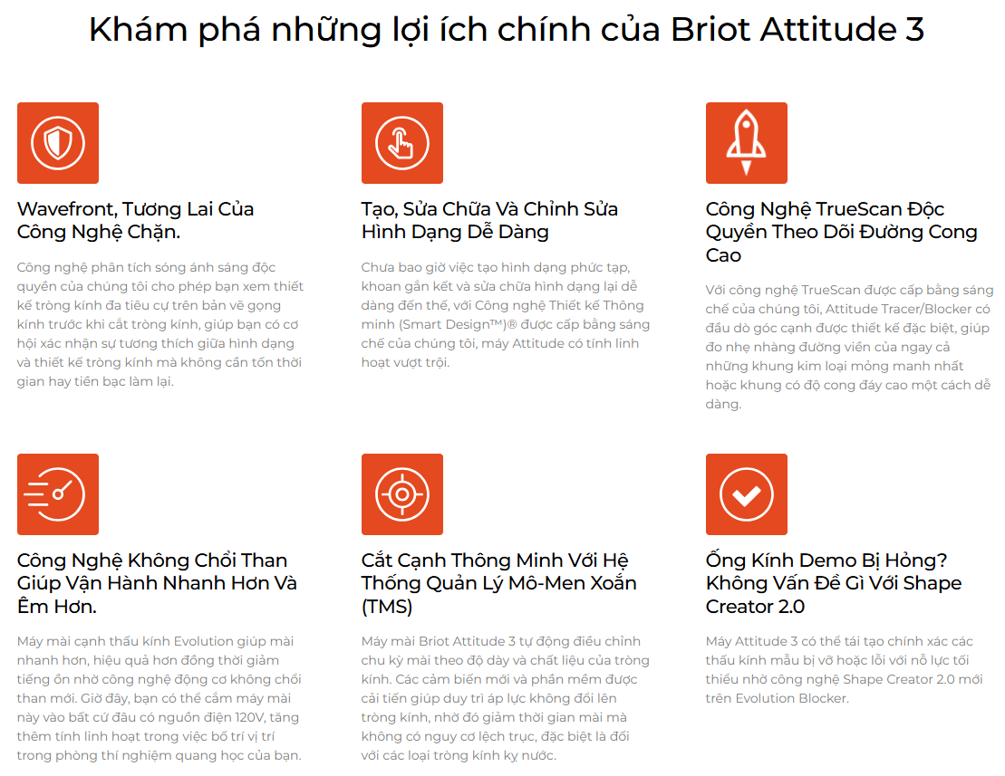 Nâng cao năng suất của bạn với công nghệ mài cạnh thông minh. Hệ thống mài cạnh Briot Attitude 3 nâng tầm khả năng của xưởng hoàn thiện kính mắt nội bộ của bạn và mang đến trải nghiệm cá nhân hóa thực sự. Độ chính xác và tốc độ đáng kinh ngạc của Attitude 3 biến nó trở thành giải pháp xử lý tròng kính hoàn hảo cho bất kỳ phòng khám quang học hiện đại nào.