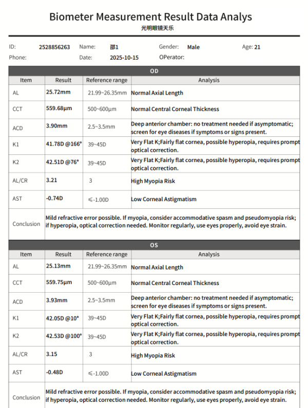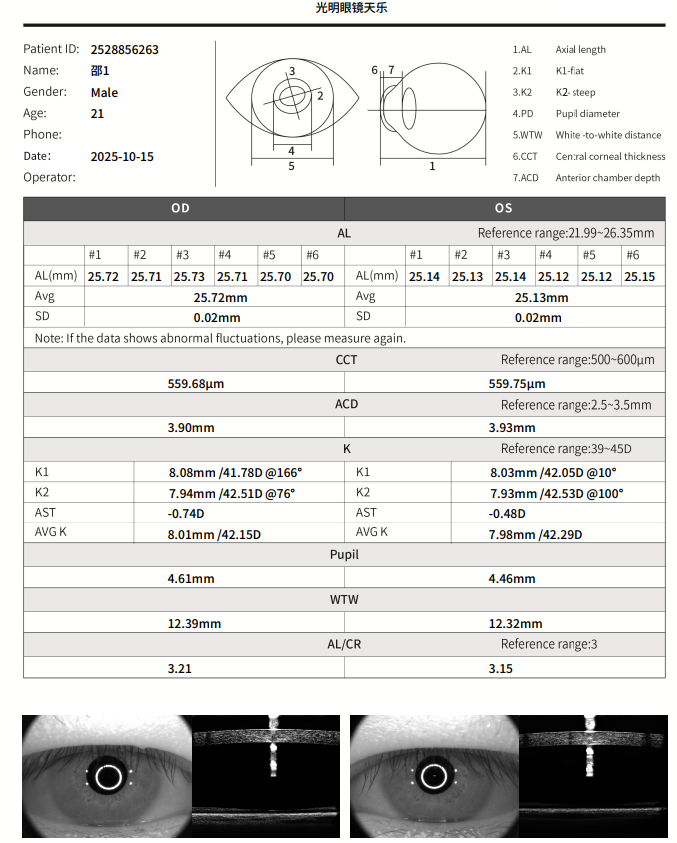 - Multiple parameters including axial length, CCT, corneal curvature, WTW, and PD.